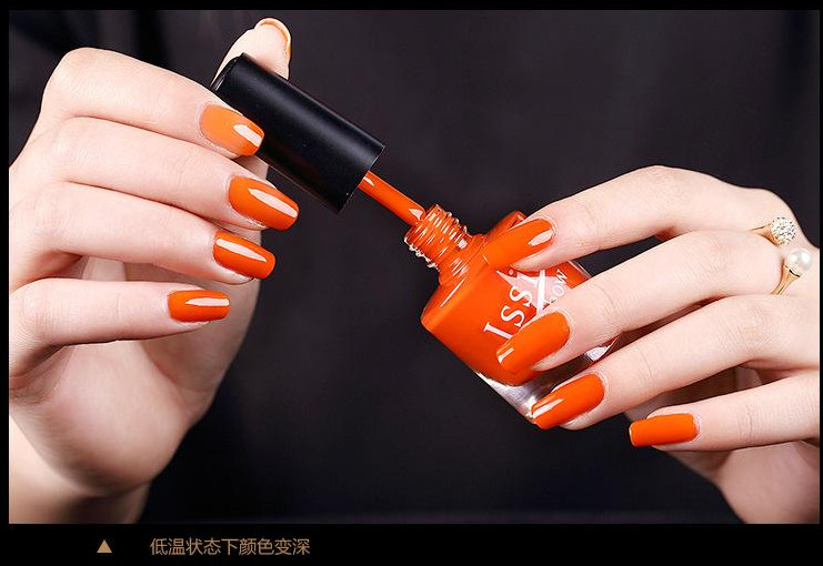 感溫變色指甲油是由溫變粉爲原料加入到指甲油裏做出來的,這種指甲油随著溫度的上升和下降而來回變色的。